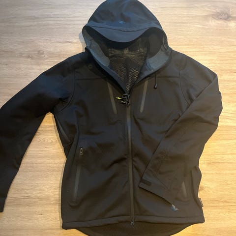 H2O Sealand Jakke i størrelse S. Jakken er vandtæt og har justerbar hætte med snøre. Materialet er designet til at beskytte mod vejrlig, velegnet til udendørs brug. Farven er mørk med lysegrå detaljer. Jakken har elastiske manchetter og flere lommer.