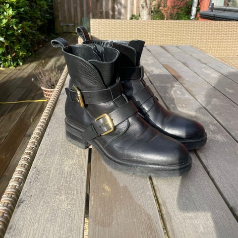 Støvler i guld af skind. Lynlås detaljer på begge sidder. Ubrugt. Har et lille mærke på siden på den ene støvle