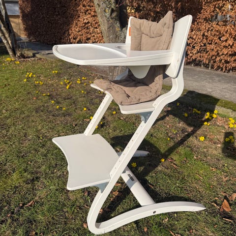 Leander Højstol Tilbehør Bakkebord i hvid med rosa bakke. Designet til børn, lavet af holdbare materialer, nem at montere og rengøre. Passer til Leander højstole og giver en praktisk spise- og aktivitetsflade.