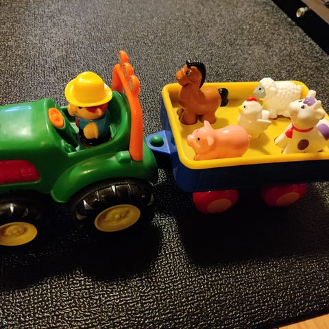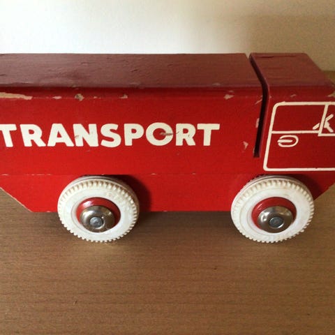 BRIO træ trailer, grøn maling og naturligt træmateriale. Traileren viser tydelige brugstegn med afskallet maling. Traileren var desværre forstor til den BRIO traktor jeg søger en trailer til (se min anden anonce)