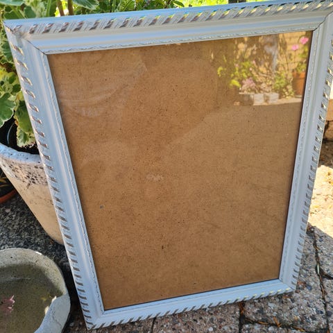 Rigtig pæn billedramme med "guld" ramme og glas, på bagsiden er der huller så den kan hænges op. Str. 25,5 x 21 cm