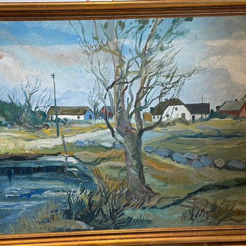 Aage Strand oliemaleri Landskab med Båd