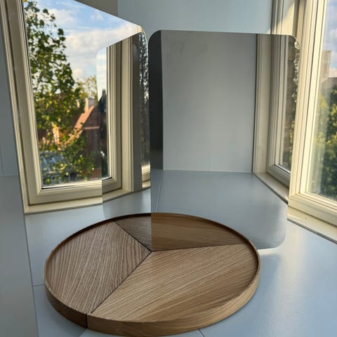 Flot rundt spejl med træramme og tappede samlinger. Måler 47,5 Ø