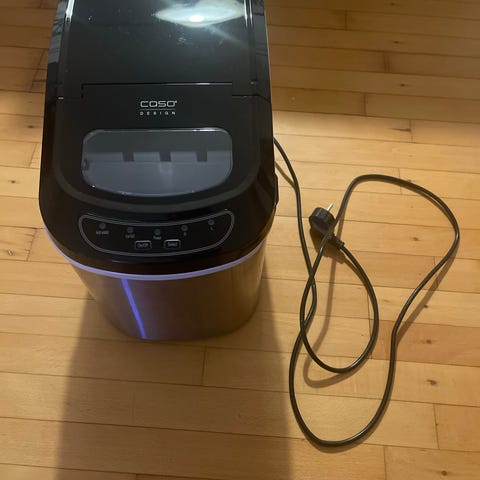 Caso IceMaster ismaskine i rustfrit stål og sort plast. Maskinen har et gennemsigtigt låg, kontrolpanel med knapper til forskellige funktioner, og en isbakke til produktion af isterninger. Designet til hjemmebrug med kompakt størrelse.