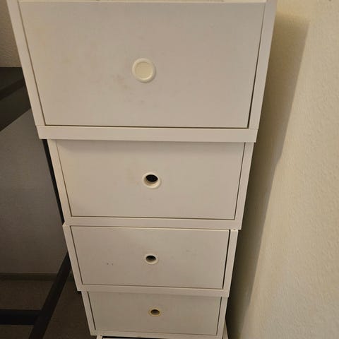 IKEA ELVARLI reol. I god stand. Med 2 skuffer, 1 bambushylde, en bøjlestang og 3 hvide hylder.