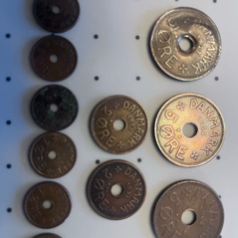 Bronze mønter Kong Christian d. X, 1 øre, 2 øre og 5 øre samlet 38 stk. Årgangene er ikke komplette. Materiale er Bronze. Mønterne er cirkulations mønter og har således været anvendt i almindelig handel. Alle mønterne har tydelige spor af slid og brug, men har ikke væsentlig skader eller ødelæggelse. I alt 38 stk. Mønterne sælges samlet og består af: