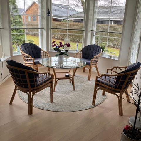 Et sæt bestående af fire lækre og robuste kurvestole plus et bord fra 1960’eren