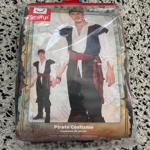 Unisex pirat kostume str. 116 bestående af en sort T-shirt med piratmotiv (dødningehoved med tørklæde og korslagte sværd), rød og sort vest med flosset kant samt matchende røde og sorte stribede bukser med elastik i taljen. Meget velholdt