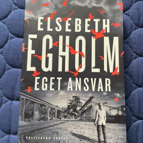 Elsebeth Egholm Eget Ansvar er en bog med sort-hvidt omslag, der indeholder en fortælling skrevet af Elsebeth Egholm. Bogen har et cover med illustrationer af fugle og et billede af en mand ved en industriel baggrund. Teksten på bagsiden beskriver forfatteren og bogens indhold.