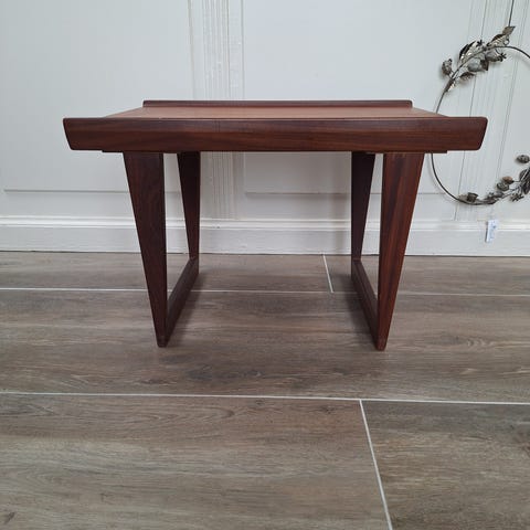 Super fint og velholdt sidebord i teak med intarsia på toppladen af Holger GeorgJensen. Både top og aflægger planen er letslebet og olieret. Stel i bejdset bøgetræ med mindre brugsspor på benene. I flot stand