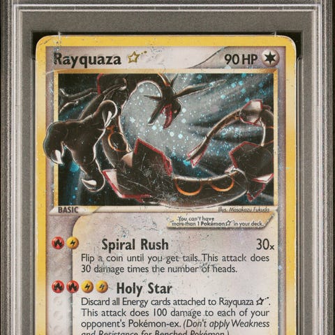 Dette kort kræver ikke meget præsentation for samlere. Super sjældent Gold Star Rayquaza og endda den endnu mere eftertragtede EU-print, med stærkere farver og generelt bedre printkvalitet. Skambud frabedes. Eneste til salg i verden lige nu i en 5,5'er