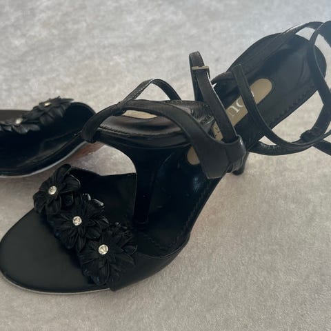 Hvide/lyse sandaler med perler og høj kilehæl.