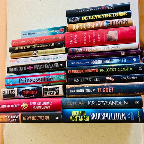 En samling af bøger fra forskellige forfattere med varierende titler og genrer. Bøgerne inkluderer både skønlitteratur og faglitteratur i forskellige størrelser og udgaver. Materialet er papirbaseret, velegnet til læsning og samling. Pris Per stk 14 kr Alle 17 bøger 200 kr