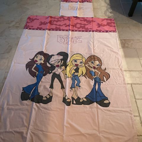 Bratz sengesæt i alm. voksenstr. (140×200 cm). Har plet i det ene hjørne (se billede) ikke forsøgt fjernet. Kommer fra røg- og dyrefrit hjem.