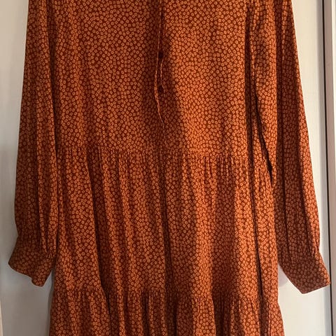 Ny og ubrugt slå om kjole fra BOII, sort med efterårsfarvede “små blomster”. Se også den anden jeg har til salg og mine øvrige annoncer.