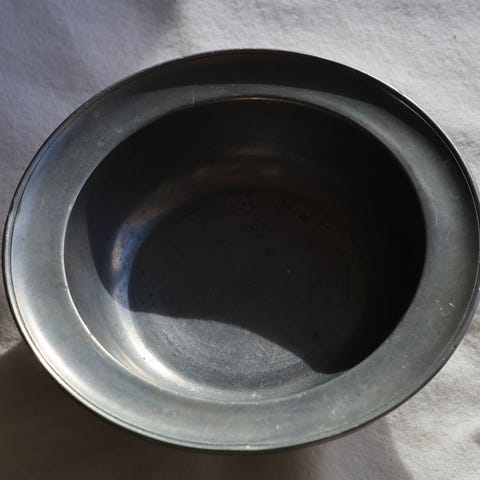 Tin ølkrus med låg, en flødekande og en rund tallerken. Sælges samlet.
