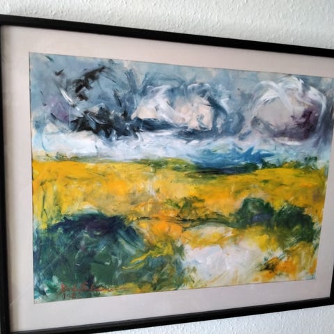 Dejligt maleri i blå og grønne farver . Maler Poul Henningsen, men jeg er usikker på navnet