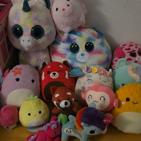 Squishmallows blandet børnetøj og legetøj bestående af flere bløde plysdyr i forskellige farver og størrelser. Produkterne er lavet af blødt materiale og egner sig til børn som krammedyr eller legetøj.