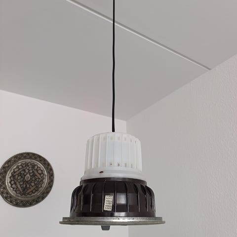 Loftslampe lavet af en gammel Nilfisk støvsuger. Med stor fatning.