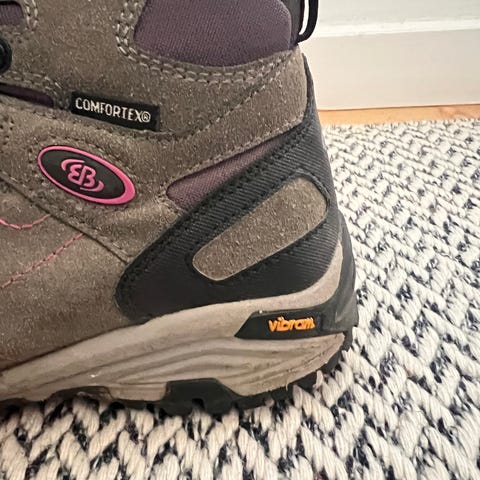 Med Wibramsål med let slid på hæl, men slet ikke skæve eller slidt. Se billede af hæl.