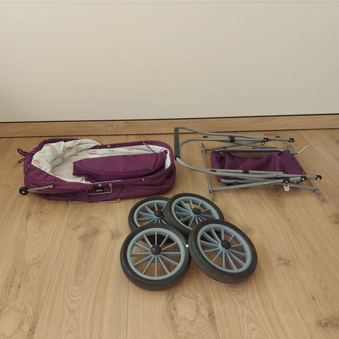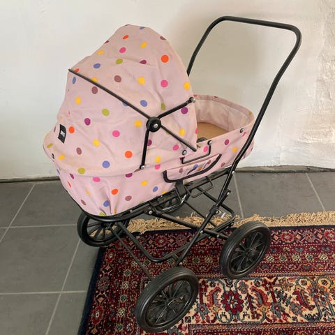 BRIO Dukkevogn med pink stof, sort håndtag og metalstel. Vognen har fire store hjul og justerbart håndtag. Egnet til børn til leg og transport af dukker.
