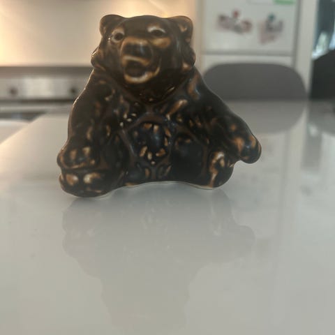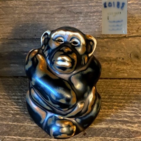 Royal Copenhagen, stentøj/ stoneware brun glasur. Abe med hånd på kind. Formgivet af Knud Kyhn. Nr. 20187. Højde 8,5 cm.