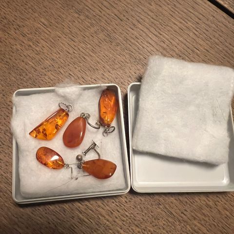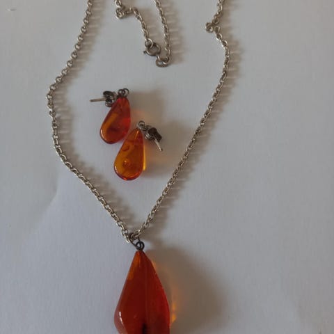 Accessorize smykkesæt bestående af øreringe og vedhæng. Materialerne inkluderer rav og sølv