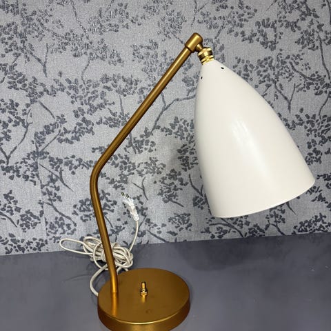 Gubi Greta Grossman Gräshoppa bordlampe i dusty blue. Lampen har et klassisk design og er egnet til brug på skrivebord eller som læselampe. Materialet er metal. Er knækket i samlingen mellem lampearm og skærm. Se billede.
