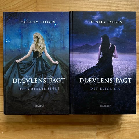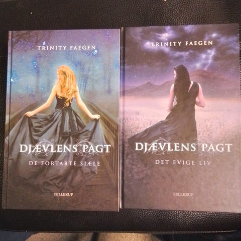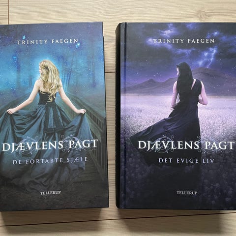 Trinity Faegen Djævelens Pagt bog sæt bestående af to bind: 'De Fortabte Sjæle' og 'Det Evige Liv'. Bøgerne er på dansk og udgivet af Tellerup. Sættet indeholder fortællinger om Sasha, der oplever mystiske og overnaturlige begivenheder, herunder hendes forbindelse til Rusland og en magtfuld figur ved navn Key. Bøgerne er indbundet med sort cover og illustrerede forsider.
