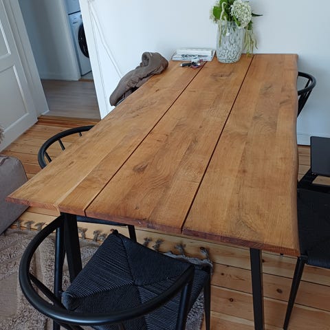 Plankebord i voksbehandlet fyrretræ med flotte naturkanter og sortmalede træben, der nemt kan skrues af under transport. Kommer fra røgfrit hjem. Vi hjælper sagtens med at bære det ud.
