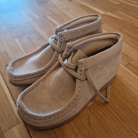 Clarks Wallabee børnesko i størrelse 39 til dreng. Skoene er lavet i sort ruskind med en karakteristisk sål. Modellen er kendt for sit klassiske design og komfort.