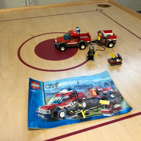 LEGO City Brandbil og Motorcykel legetøjssæt med brændende hus, brandbil med tilhørende slange og motorcykel. Sættet indeholder figurer og tilbehør i farverne rød, gul og sort. Fremstillet af plastik, egnet til børn.