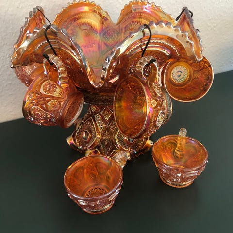 I en reklame fra 1915 kan man læse at 'Bowlen kan bruges uden fod som frugt- eller salatskål. Foden kan vendes rundt og fungere som vase, og kopperne kan bruges til at servere dessert eller is. I sandhed et vidunderligt punch-sæt' ( se mere historie her: https://www.carnivalglassworldwide.com/imperial.html )