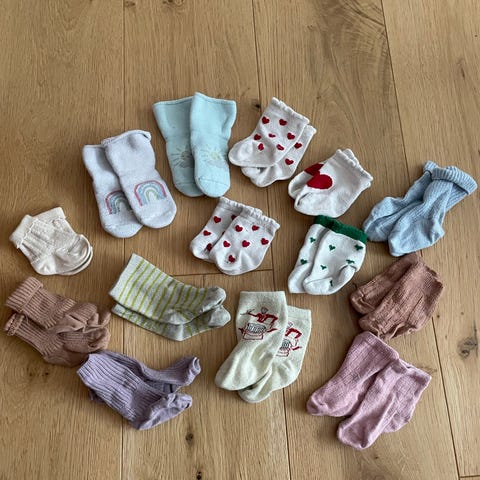 Strømper fra Konges Sløjd + nogle andre, jeg ikke kan huske, hvor er fra. Alle sokkerne på billede 2 er Konges Sløjd. Sokkerne på billede 3 tror jeg, der er noget uld i, men jeg er ikke helt sikker. Nogle er størrelse 16-17 - andre er større størrelse, men jeg synes, de er små i størrelsen. God kvalitet og sidder godt på foden - vi har været glade for dem, særlig dem, der måske er uld i. Prisen er for dem alle. Vi har brugt dem i størrelse 56-62 og nogle også i 68