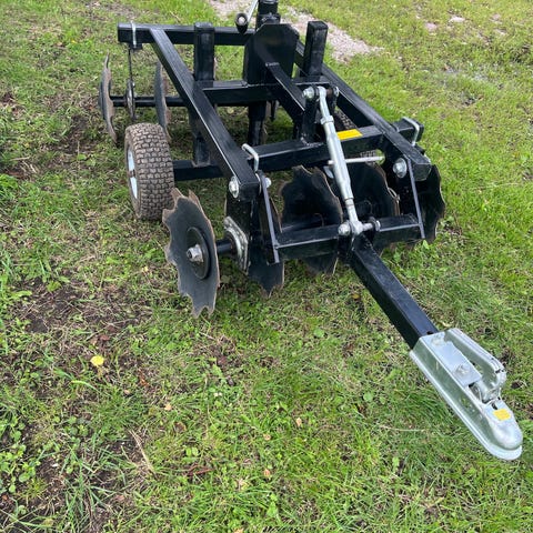 Harve med elløft til ATV, kræver min. en 500 m³ maskine. Der er spidsharve tænder, som kan vendes og gåseføddertænder.
