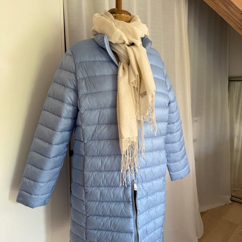 Knælang dunfrakke (jeg måler 1,75 m). Desværre købt for lille, derfor næsten ikke brugt. Den er både vind- og vandtæt. En rigtig god kvalitet. Kraftig lynlås der kan lynes begge veje. Desuden lynlås bagpå (til cykling). Der er vindfang i ærmerne. Ny pris 2.000 kr.