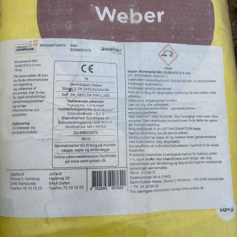 Weber Cempexo Universalmørtel KC 50/50/700 er en pakkemørtel beregnet til fuging af murværk og pudsning af ud- og indvendige vægge. Produktet leveres i en 15 kg pose. Der er stadig en hel del tilbage, som det ses på billedet
