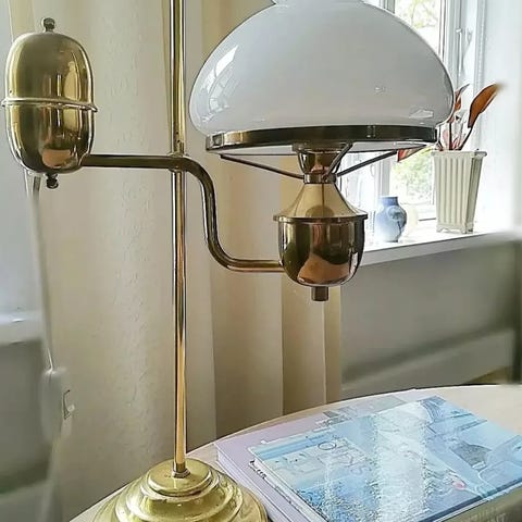 i messing med grøn metalskærm. Skærmen kan indstilles i højden.