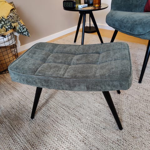 Skammel i grå velour og sorte metalben