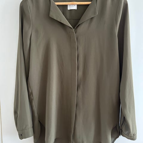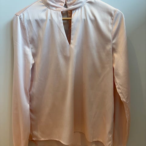 Vila Bluse i lyserød farve, størrelse XL. Blusen har lange ærmer med elastik ved ærmekanterne og en rund hals med bindebånd. Materialet er let og blødt med elastisk smock-detalje omkring taljen for pasform.