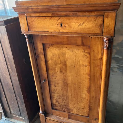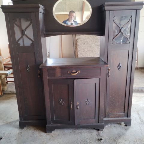 Smukt, massivt skab i mørk eg med fine håndskårne detaljer og ovalt spejl i midten. Skabet har både skabe, skuffer og hylder, samt originale nøglehuller og beslag.