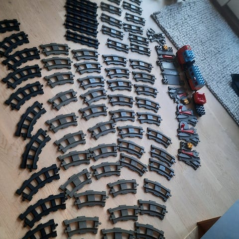 LEGO DUPLO Togbane sæt indeholdende et tog, skinner, en bygning med klokke, figurer og en grøn byggeplade. Der er også noget zoo Lego og dyr.
