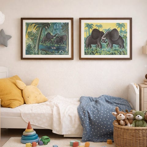 Sæt bestående af 2 billeder med elefantmotiver i farverige landskabsscener. Malerierne er indrammet og viser elefanter i forskellige naturmiljøer med baggrunde af bjerge, træer og himmel i levende farver. Rammerne er mørke lilla og malerierne har ophængningssnor på bagsiden. Velegnet til vægophængning som dekoration.