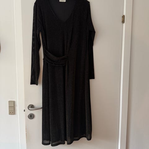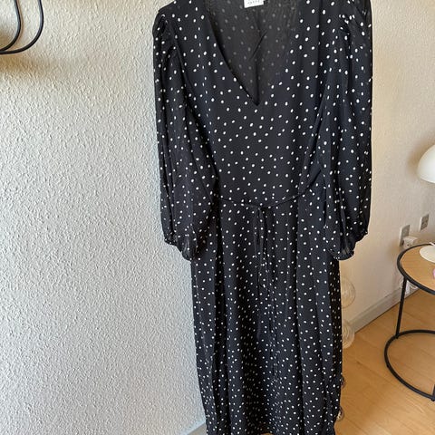 Flot mørkeblå kjole med hulmønster over skulder samt drapering over mave - lynlås i siden ,der er inder foer i kjolen