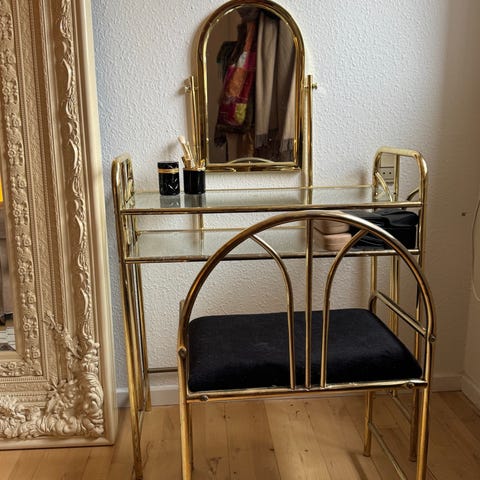Der er en del patina og brugsspor på både sminkebord og stol som ses på billederne