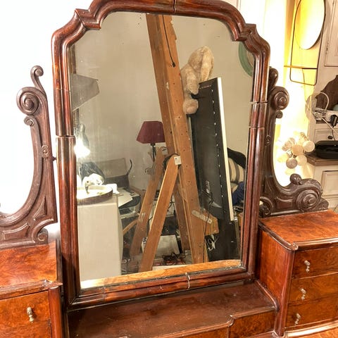 Spejlet måler i højden 68 cm, bredden er ca. 87 cm når siderne er slået ud.