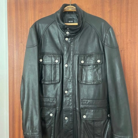 Hugo Boss Dreeves Jakke i størrelse L til herre. Jakken er brun og lavet af 100% kalveskind, hvilket giver et robust og slidstærkt materiale. Jakken er designet til udendørs brug og har en klassisk knaplukning.