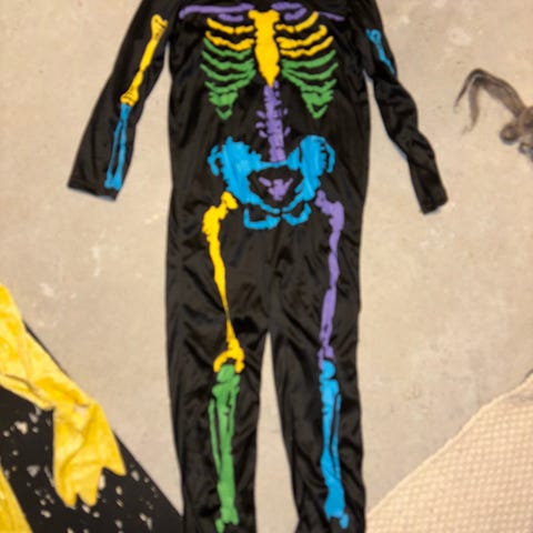 H&M Halloween kjole til kvinder i sort farve med skeletmotiv. Kjolen har lange ærmer og et lag af sort tyl med skeletprint langs kanten. Materialet er blødt og velegnet til udklædning ved Halloween eller temafester.