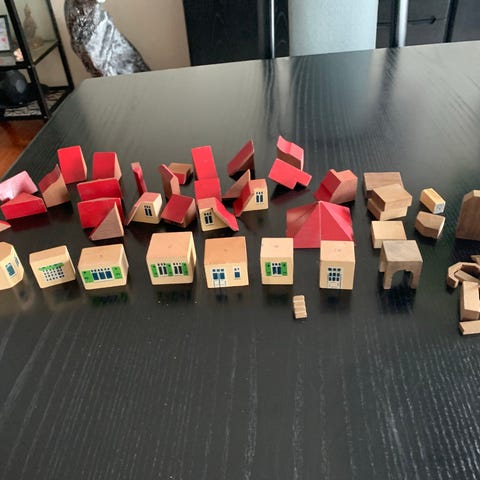 Legetøjsstation i træ med rød tag og gul facade. Indeholder tre åbninger med røde døre. Kan bruges som legetøj til børn til rollespil og kreativ leg.