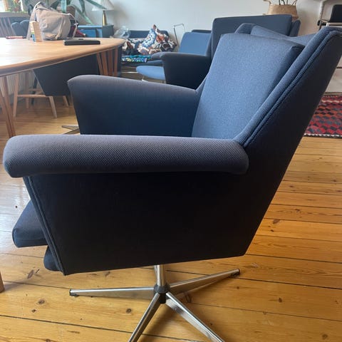 Flotte armstole i design med en vibe af retro. Man sidder rigtig godt i kvalitetsstolen, som er købt i Paustian. Kan bruges i stuen eller som mødestol. Polstret med blåt uldstof. Stolen er spændt fast på elegante stålben (ruller ikke).